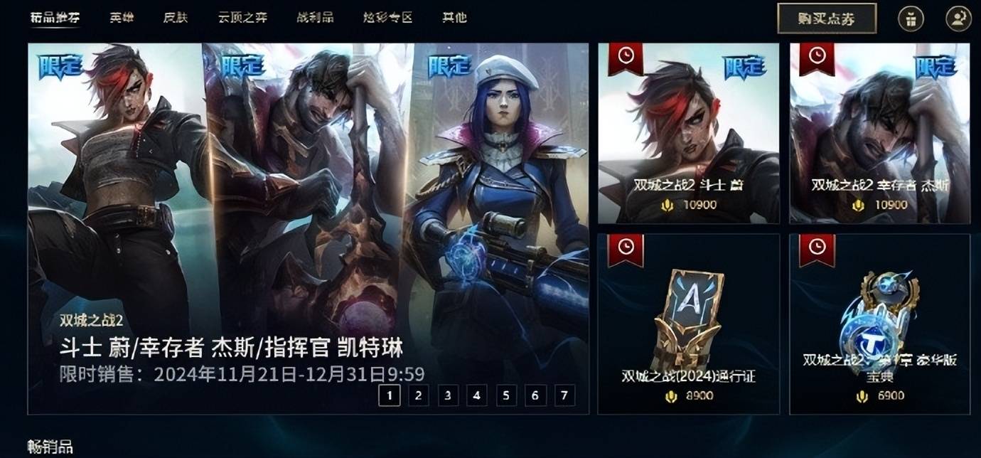 今日进行的14.23版本,《双城之战》第二季系列皮肤正式上线。其中,几个主要角色杰斯、蔚、凯特琳都是传说限定。单个皮肤售价均为10900点券,如果加上礼包,这个价格还得提升到14350点券。
