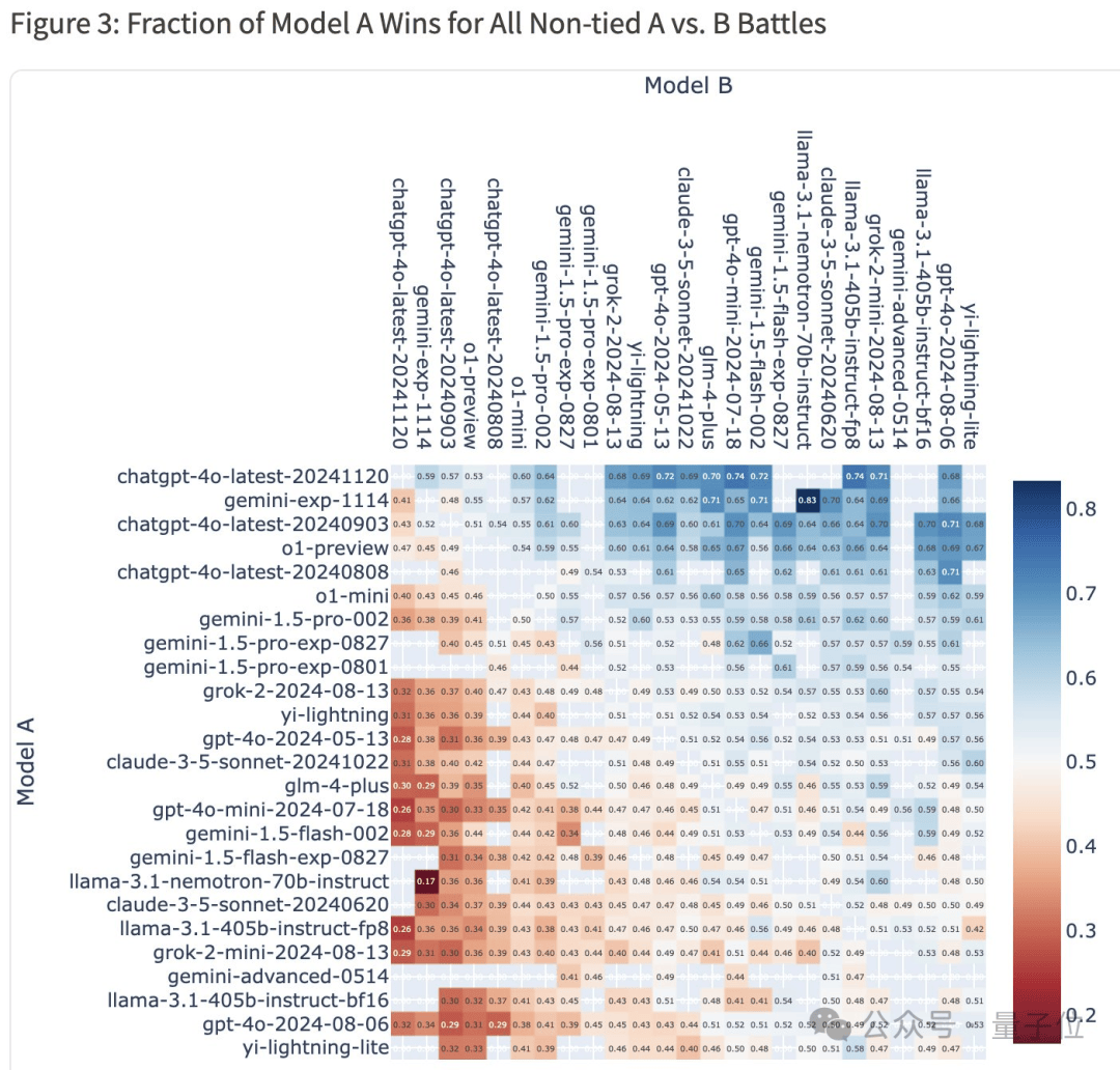 总胜率热图显示,新版4o对上此前登顶的Gemini-Exp-1114,胜率为 59%;对上Claude 3.5 Sonnet,胜率为 69%;对上5月版本的4o,更是在 72%的情况下都能取胜。