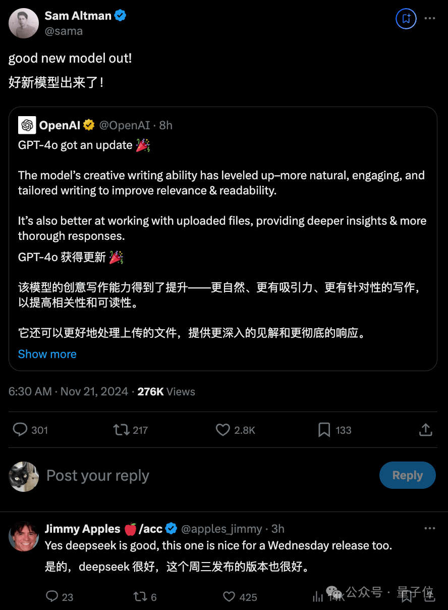 结合今日份DeepSeek的大新闻——,不少网友直接在奥特曼“新的好模型来了”的推文下贴脸嘲讽起来: