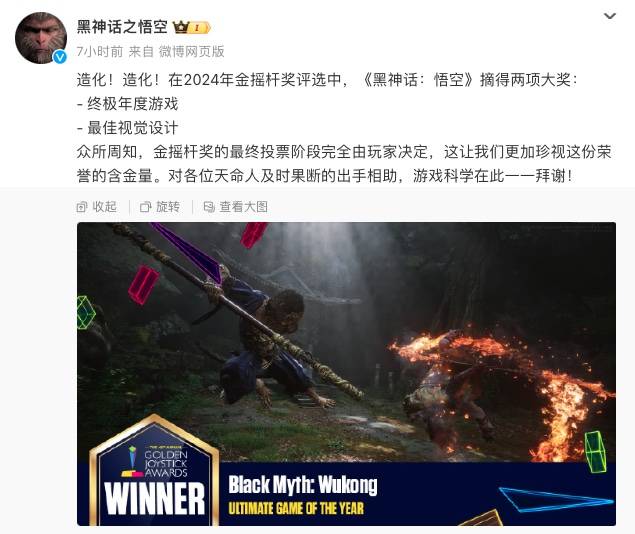 今天凌晨,2024 金摇杆奖正式公布,国产 3A 游戏《黑神话:悟空》摘得“终极年度游戏”与“最佳视觉设计”两项大奖。