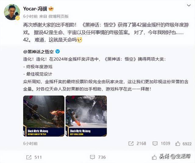 凌晨,游戏制作人、开发商游戏科学CEO冯骥@Yocar-冯骥 微博发文中表示:“再次感谢大家的出手相助!《黑神话:悟空》获得了第42届金摇杆的终极年度游戏。据说42是生命、宇宙以及任何事情的终极答案。对了,今年我刚好也……42。难道,这就是天命吗?”
