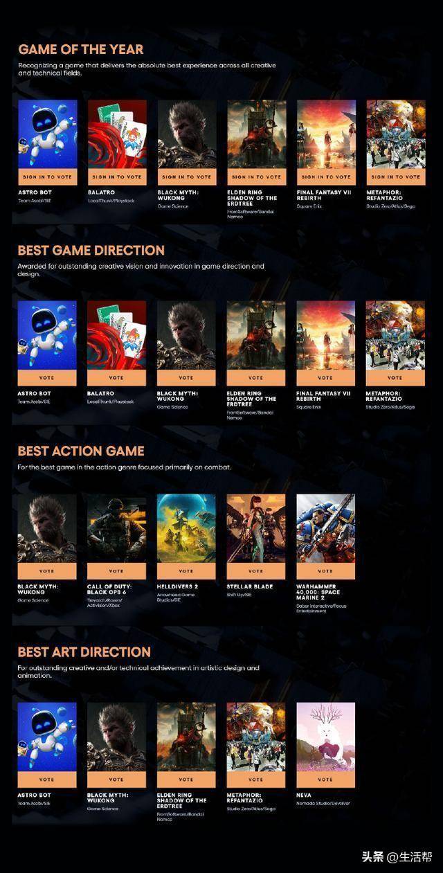 此前,2024年度游戏大奖(TGA)也通过官方微博公布了各类奖项的提名名单。
