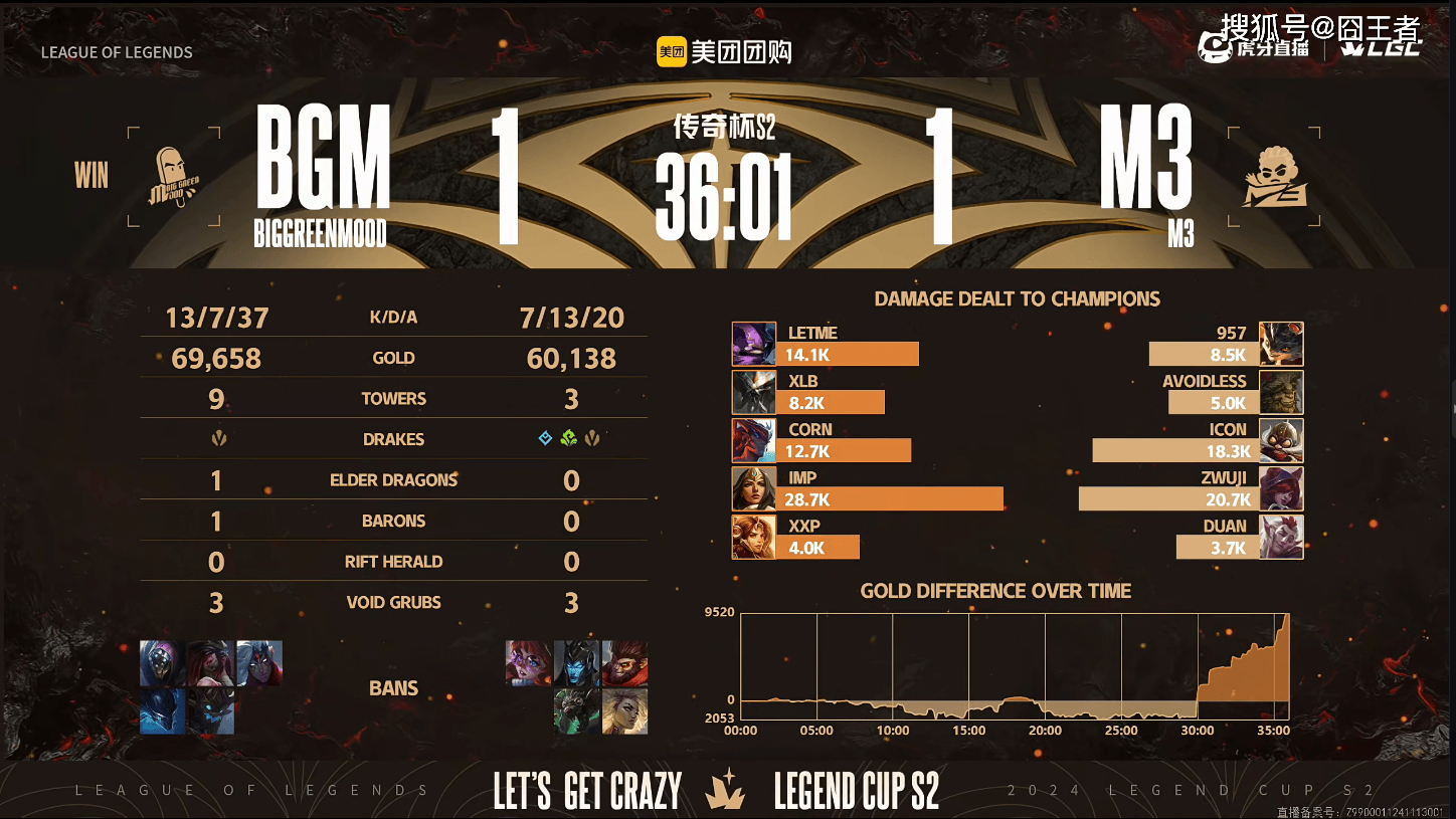 结果决胜局,双方各打了半场好局,M3笑到了最后。比赛前期M3一度打出5k经济领先。比赛第20分钟左右,M3追击被BGM抓到机会打出一波1换3;比赛第22分钟左右,两队爆发大龙团。957格温拿下大龙但Corn彗三杀帮助BGM一波打出0换4大胜;比赛第25分钟左右,两队爆发龙魂团。Imp薇恩一波三杀帮助BGM打出2换4;比赛第37分钟左右,Imp薇恩追击中击杀两人,BGM拿下大龙打出0换3,随后BGM拿下龙魂反超5k经济;最终比赛第45分02秒,M3最后一搏推高地击杀Corn彗,M3各处追击团灭BGM后结束比赛、