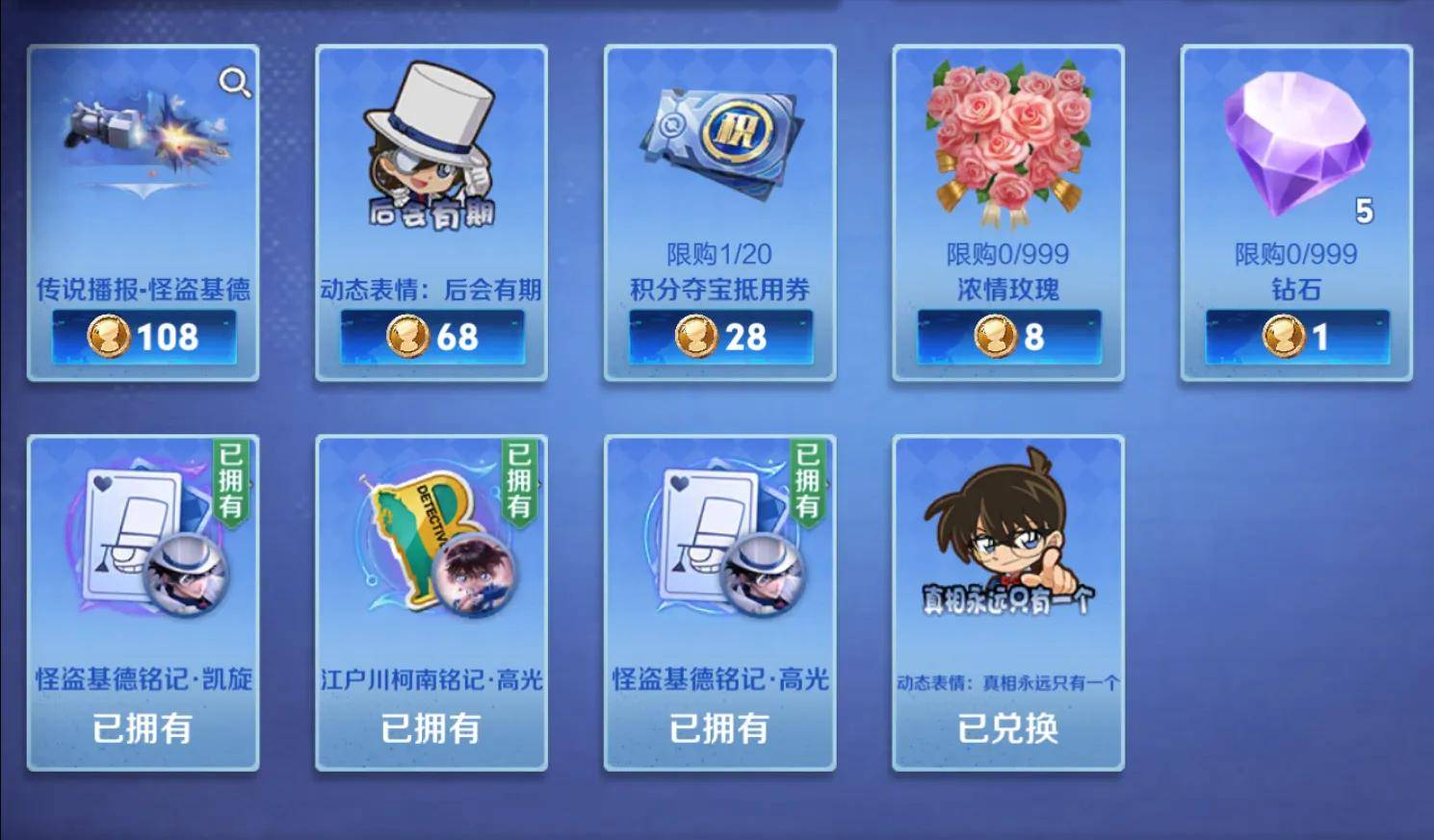 我们可以看到在此次开展的活动兑换商城当中,用28个侦探币就可以兑换一张积分夺宝券。