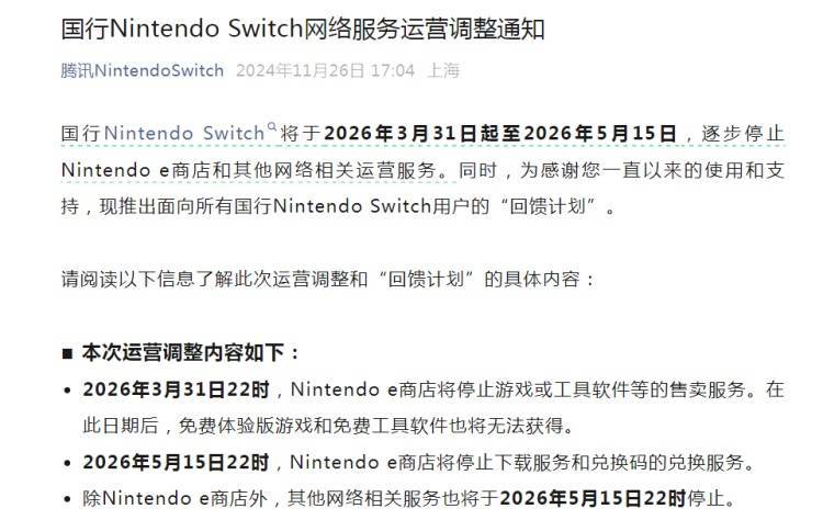 据公告,2026年3月31日22时,Nintendo e商店将停止游戏或工具软件等的售卖服务。在此日期后,免费体验版游戏和免费工具软件也将无法获得。2026年5月15日22时,Nintendo e商店将停止下载服务和兑换码的兑换服务。除Nintendo e商店外,其他网络相关服务也将于2026年5月15日22时停止。