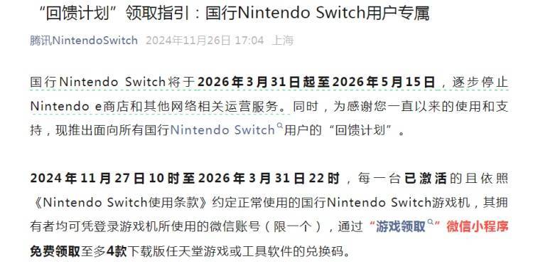 11月26日,腾讯官方宣布任天堂国行Switch将于2026年3月31日起至2026年5月15日,逐步停止Nintendo e商店和其他网络相关运营服务。这意味,届时游戏将无法下载、游戏无法联机。