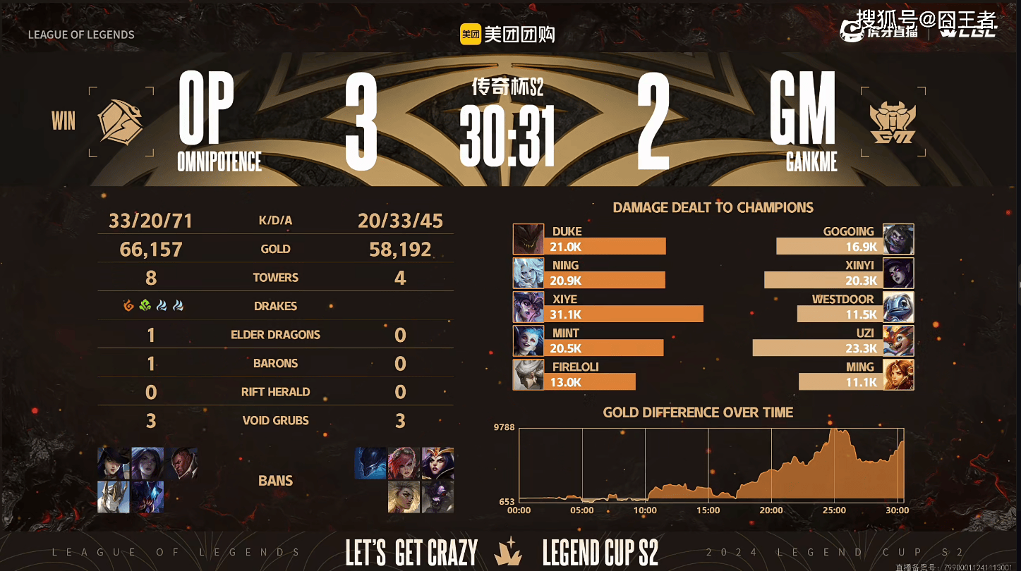 结果第五局比赛,又被OP战队打成了碾压局。3分钟左右,GM下路先手开到金克斯并击杀,随后Ning及时支援击杀Uzi;7分钟左右,GM上路三人越塔石头人,随后OP中野赶到打出一换二;9分钟左右,Xinyi莫甘娜致命失误打炸中路,OP众人包夹打出0换2;11分钟左右,节奏全崩,GM下路强行越塔石头人及时TP支援击杀GM三人;21分钟左右,西门走位失误白给,OP持续追击打赢团战;最终30分31秒,OP团灭GM,赢下了整场比赛。