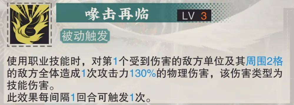 然后是针对仙鹤三个被动技能的讲解,其中第一个被动是仙鹤最重要的被动,基础状态下可以让职业技能攻击到的第1个敌方和其身边2格范围内的全体造成一次物理技能伤害,此外这个技能所造成的范围伤害也可以范围施加“流失”状态。