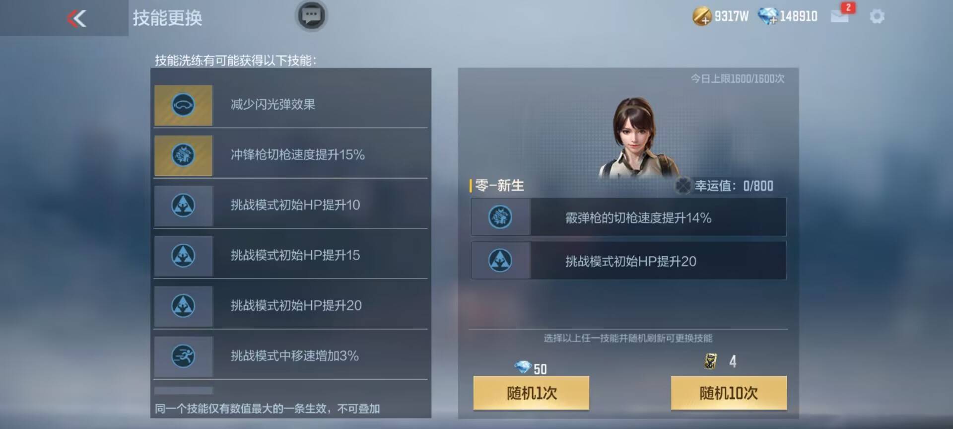 重点来啦,零-新生配备了两条可洗炼技能槽,可洗炼的技能有:减少闪光弹效果、挑战模式HP提升、挑战模式移速提升、冲锋枪/霰弹枪/步枪切枪速度提升、暴击获得钻石幸运值增加。大家可以按需洗炼并选择。