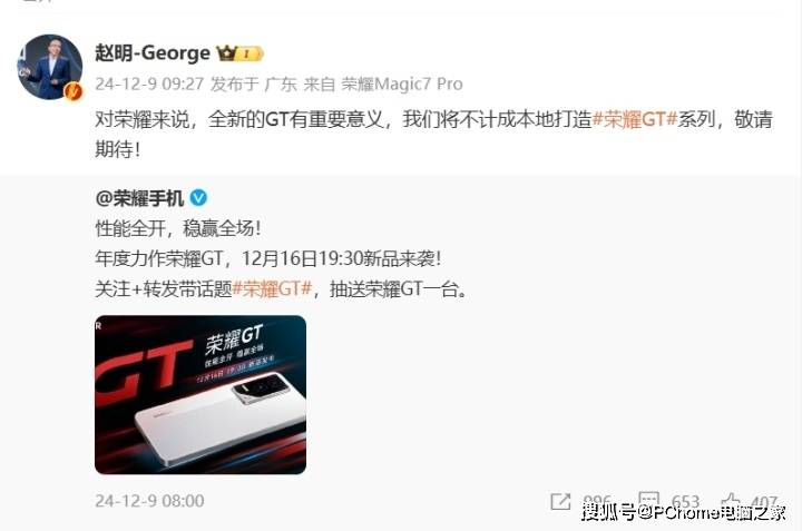 12月9日,荣耀官方宣布荣耀GT将于12月16日正式发布,随后荣耀CEO赵明转发并评论道,荣耀将不计成本打造荣耀GT系列。