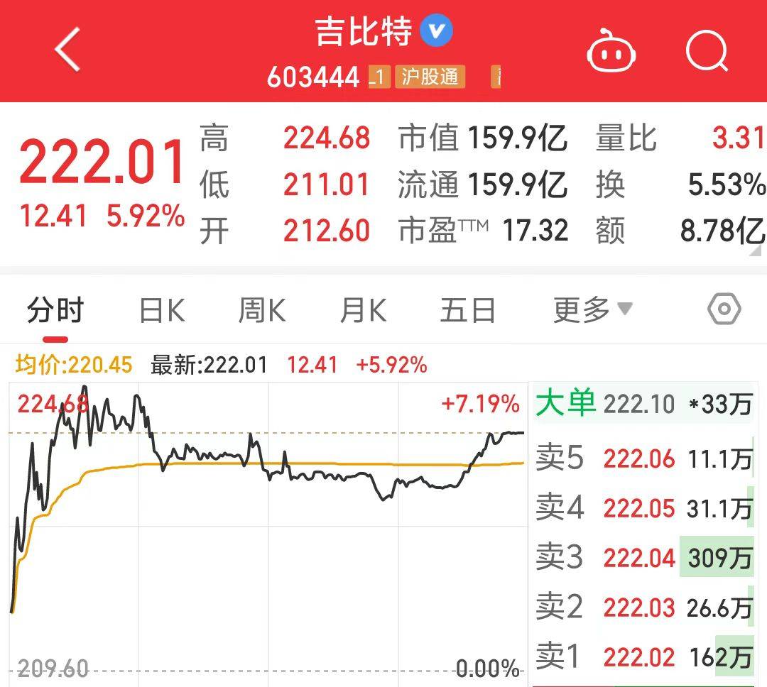 12月9日,吉比特(603444.SH)股价高开高走,一度涨超7%,收涨5.92%,报222.01元/股,总市值159.9亿元。