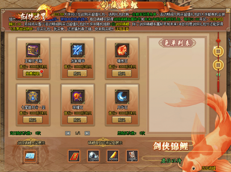 领取免费礼包以及选购活动珍珠贝礼包,即可参与锦鲤抽奖!抽中锦鲤即可获得超稀有锦鲤称号以及未来1年的游戏粮票,每月可领大量的绑金与稀有材料!更有机会抽中“超级剑侠锦鲤”,将会额外获得飞天茅台奖励!