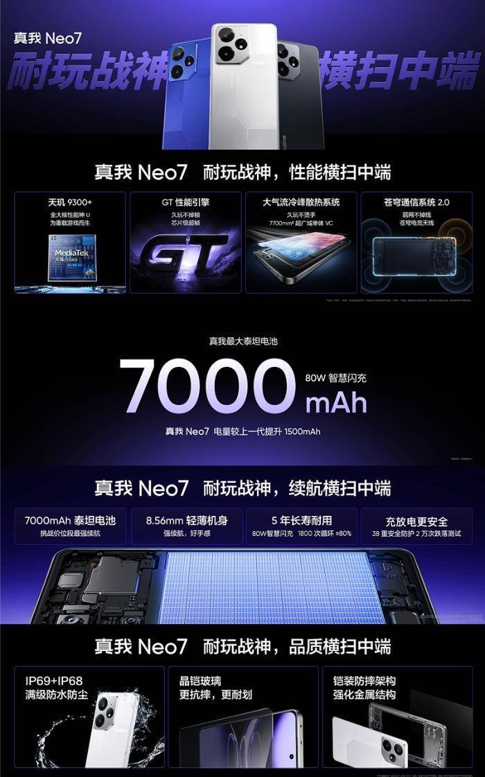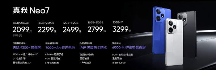 12月11日,真我Neo7正式发布。新机搭载天玑9300+、首发7000mAh泰坦电池,并带来IP69+IP68满级防尘防水,限时售价2099元起,将于12月16日全渠道正式开售。
