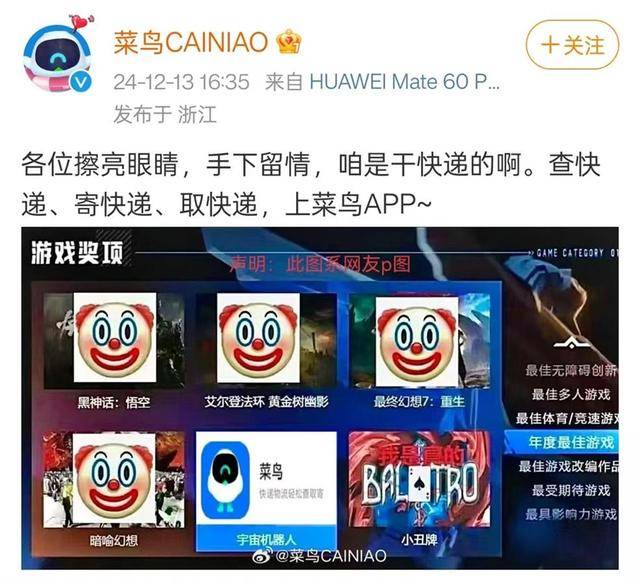 12月13日下午,菜鸟官方回应称:各位擦亮眼睛,手下留情,咱是干快递的啊。查快递、寄快递、取快递,上菜鸟APP。