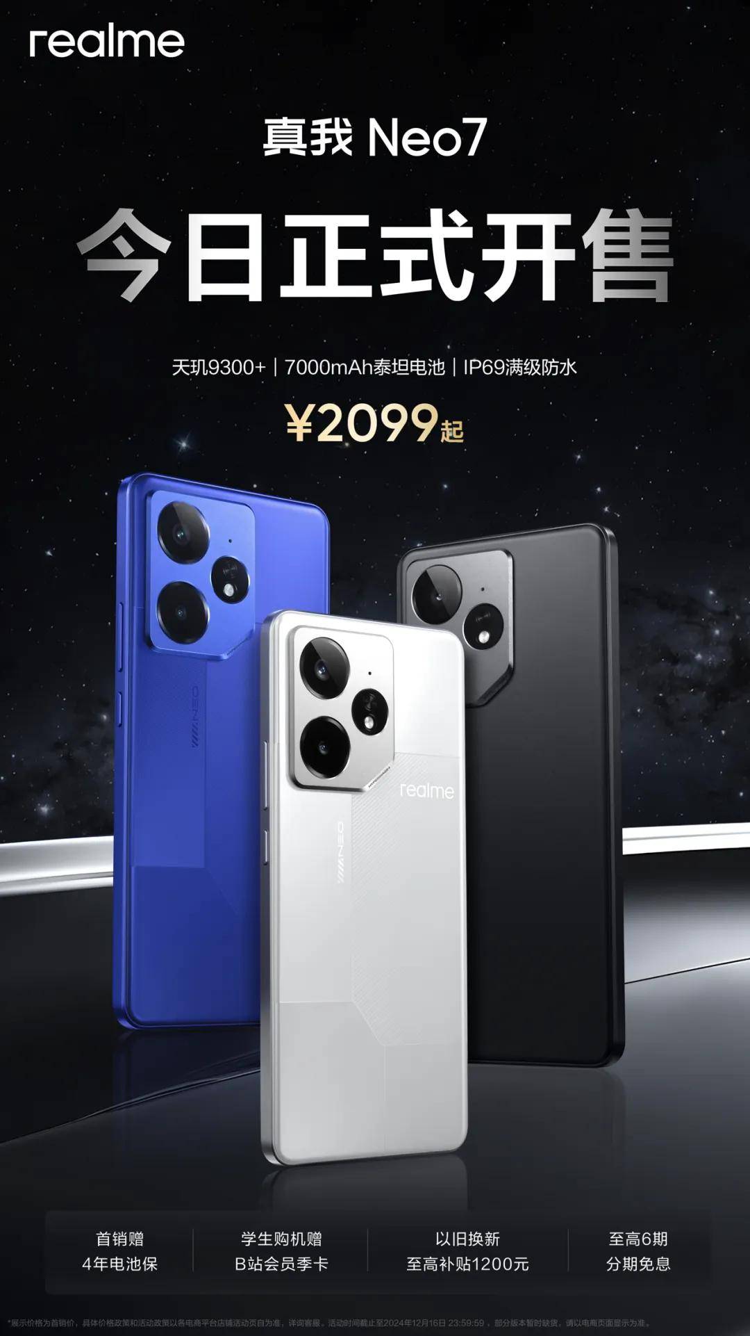 2024年12月16日,真我Neo7于今日10点全渠道正式开售,仅需2099元起。真我Neo7搭载天玑9300+旗舰芯、7000mAh泰坦电池和IP69满级防水,凭借横扫中端的性能、续航和品质,一经发布便热度飙升,先后取得了预售和首销的佳绩,实现口碑销量双丰收。