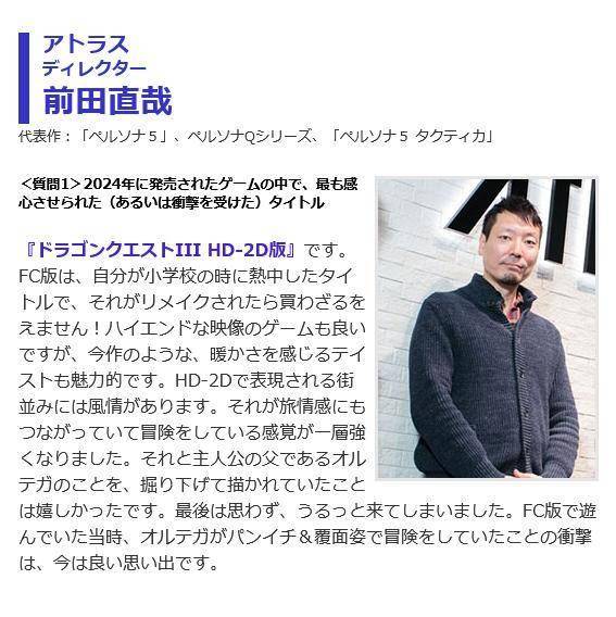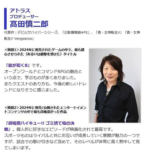 此外,这三位开发者今年最喜欢的游戏分别是《如龙8》(高田慎太郎)、《勇者斗恶龙3 HD-2D版》(前田直哉)以及《黑神话:悟空》(和田和久)。