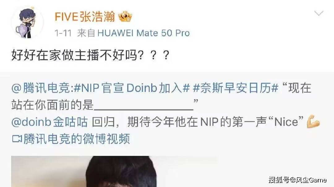 在IG和NIP比赛开始之前,张浩瀚就发了一条微博:好好在家做主播不好吗?这话的意思很明显,说的就是Doinb,而且据黄旭东爆料,IG一众老板,去现场观赛的时候,张浩瀚还做了一个“Doinb好好去直播吧”的灯牌,原本IG赢了的话,就打算把灯牌举起来,但最后IG输了没能如愿。