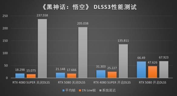 由于《黑神话:悟空》暂未引入DLSS光线重建技术的支持,它对性能的要求其实相当可观,两张GPU在原生渲染下都带来了并不出彩的成绩。但是,在开启DLSS 3后,RTX 5080的表现比RTX 4080 SUPER翻倍,提升十分显著。