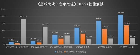 从数据上来看,我们可以清楚地看到,同样在2X模式下运行时,DLSS 3+RTX 4080 SUPER与DLSS 4+RTX 5080的性能表现相差十分显著,最新的Transformer模型架构与Blackwell架构的高效相信都居功甚伟。这样的差距在更高阶的多帧生成3X甚至4X模式下显得更加显著。