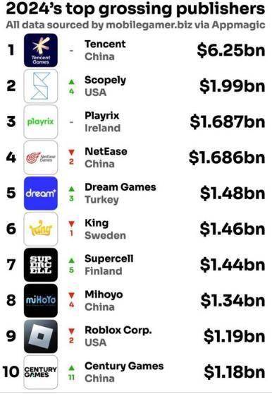 ·根据数据显示,第二名是美国的Scopely公司,销售额约为19.9亿美元,第三名则是爱尔兰的Playrix公司,销售额达到16.87亿美元,第四名是网易,约为16.86亿美元。