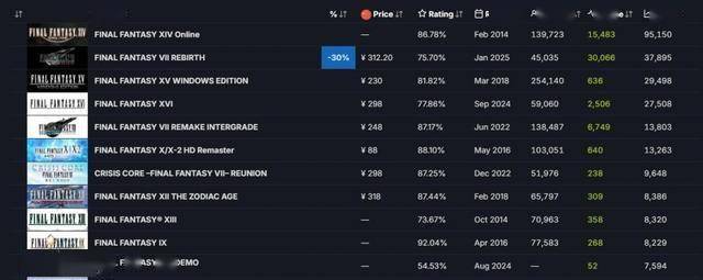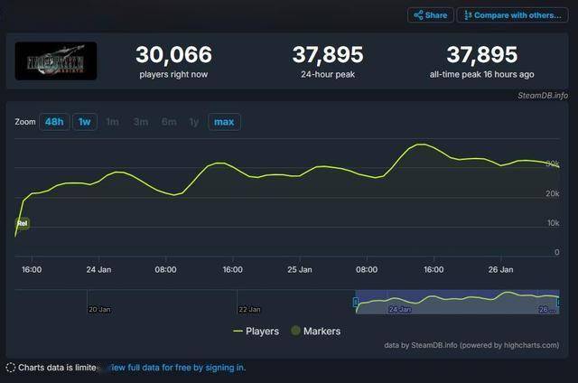 《最终幻想7》重制三部曲第二部《最终幻想7:重生》现已正式登陆PC,其中Steam版首发同时在线玩家数量峰值达到了37895,超越了前作《最终幻想7:重制版》的数据13803,成为了Steam上《最终幻想》系列玩家同时在线数量峰值最高的游戏(单机游戏,《最终幻想14》除外)。