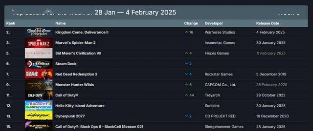 Steam2025年最新一周游戏销量排行榜出炉(2025年1月28日-2025年2月4日,无免费游戏),本周《天国:拯救2》首发成功登顶,1月30日发售《漫威蜘蛛侠2》和《凯蒂猫岛屿冒险》也登上了榜单,分别位于第二和第八,另外《文明7》、《怪物猎人:荒野》预购也登上了榜单。