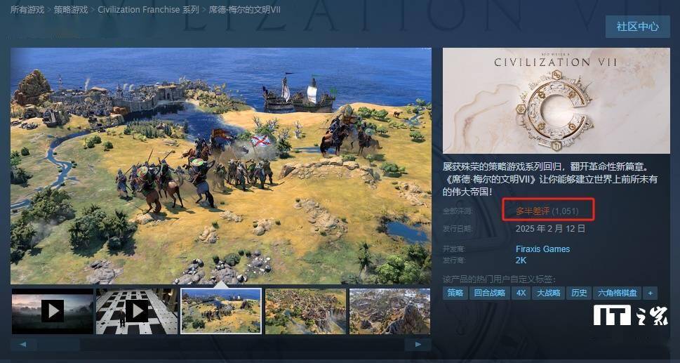 IT之家 2 月 6 日消息,《文明 7》游戏将于 2 月 12 日正式发售,在此之前已经有豪华版玩家解锁了这款游戏,Steam 平台显示为“多半差评”,有部分玩家反馈出现“闪退”等问题。