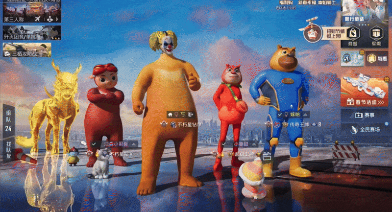 通过这样的内容输出模式,《熊出没》IP得以将自己和《和平精英》进行深度绑定,并在浩如烟海的内容更新中长期陪伴玩家,帮助产品与潜在用户建立联系。在这个过程中,游戏既没有背离合家欢的联动主题,又让《熊出没》的陪伴和全民属性自然渗透进玩家圈层,创造出春节特有的热闹氛围。要我说,这才是此次《和平精英》做得最狠,同时也是别人最难学到的一环。不仅如此,在《和平精英》包罗万象的游戏生态中,《熊出没》还有机会跟游戏曾经联动过的《猪猪侠》《奥特曼》等经典童年IP,碰撞出不一样的火花。你能够看到,身穿火箭小子的光头强,在P城追着海洋之心的超人强和猪猪侠跑;同时熊大还能开着玛莎拉蒂,联手奥特曼大战巴啦啦小魔仙;另一边,关羽也在冠军基地上纵马驰骋,扛着步枪和大刀上演迪迦追逐战的戏码。