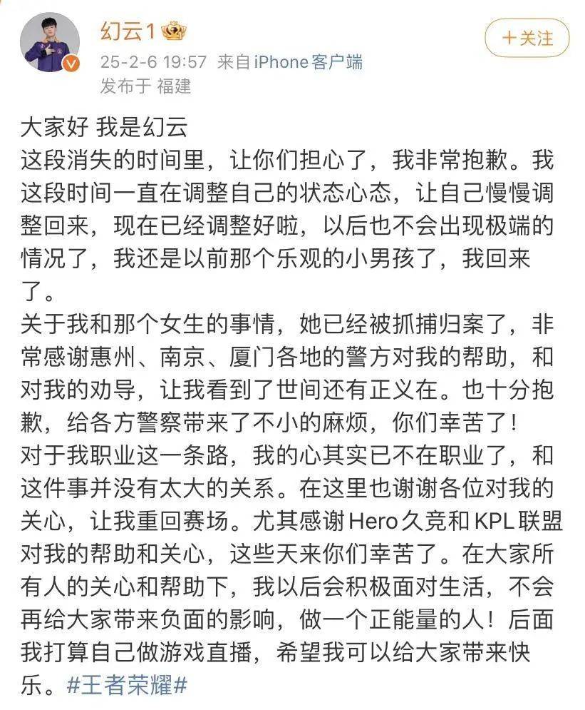 赖润豪在2月6日的发文中还提到, 与其交往的女生已被抓捕归案,他感谢惠州、南京、厦门警方提供帮助。“在所有人的关心和帮助下,我以后会积极面对生活,不会再给大家带来负面影响,做一个正能量的人。”