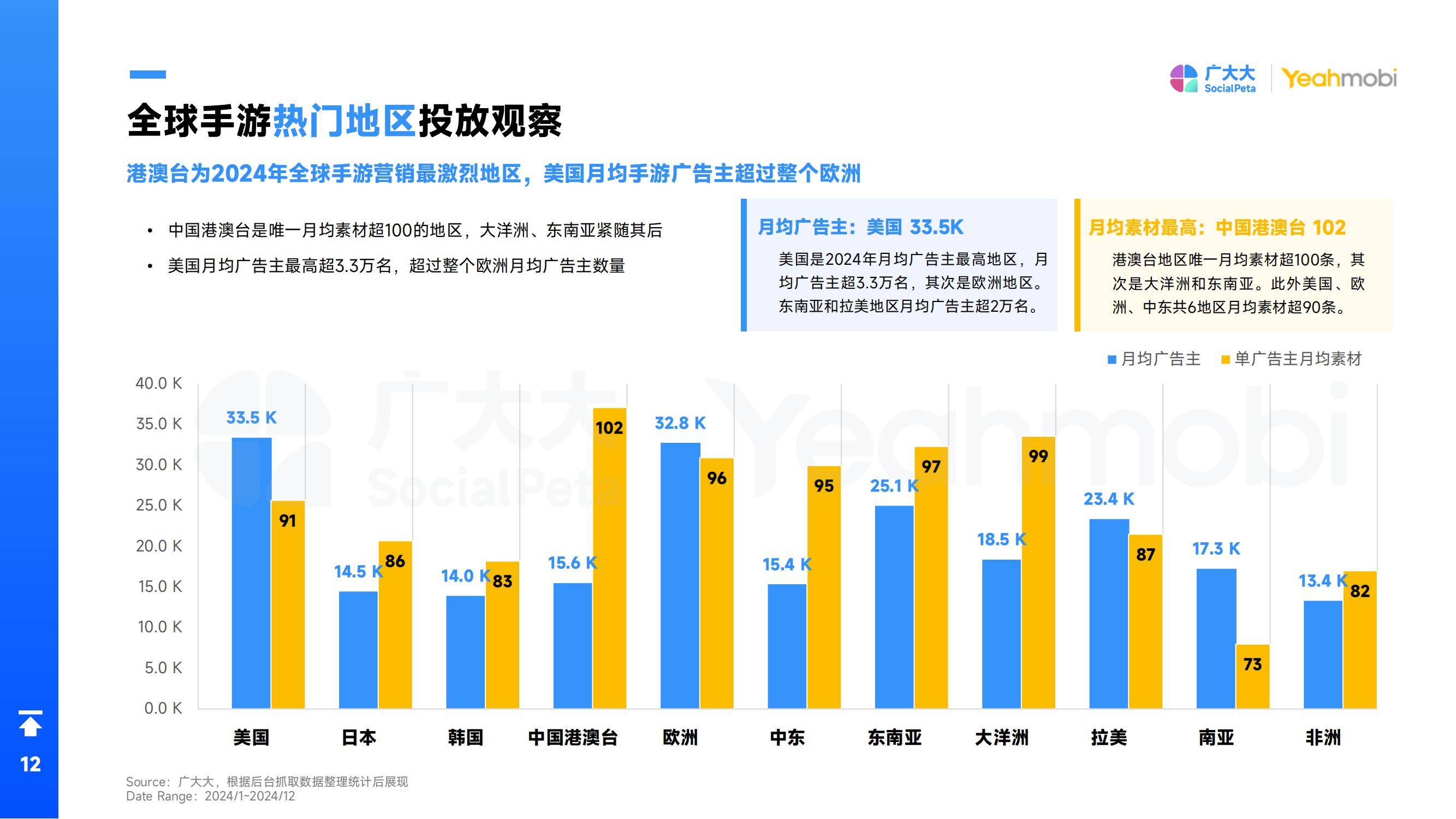 2024年广大大抓取全球手游广告主超25万名,同比增长超60%。越来越多手游产品开始广告投放,预估2025年手游广告主数量将超过30万名。全球手游素材突破450万,同比增长15.4%,比去年增幅要下降14.4%。现在全球素材数量进入稳定增长期,预估2028年全球手游创意数超过千万。