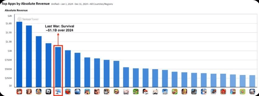 【5】 元趣《Last War》海外月流水超15亿元。Sensor Tower统计,元趣SLG手游《Last War》在2024年年收入超11亿美元(约80.17亿元人民币),到了2025年1月《Last War》预估流水收入达到了15亿元人民币。