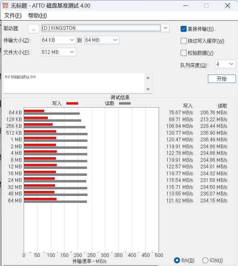 读写速度方面,同样选用测试软件ATTO Disk Benchmark来对这款金士顿x双城之战II联名闪存盘套装黑默丁格款进行测试。