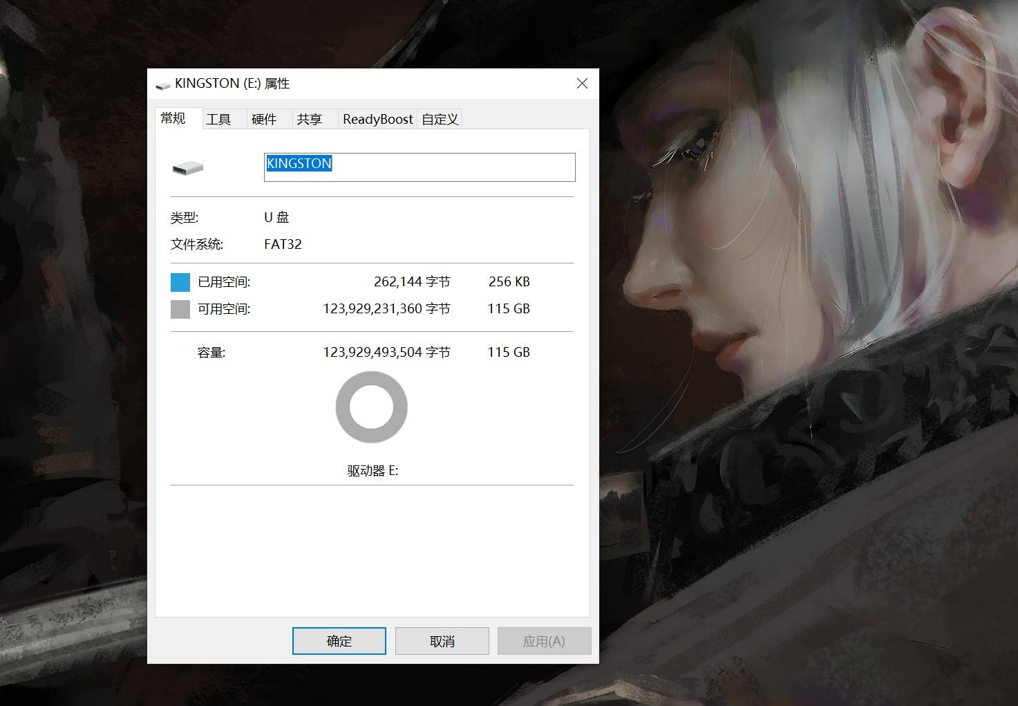 连接到Windows电脑后,通过系统属性页面可以查看这款U盘的相信信息。我们拿到的这块金士顿x双城之战II联名闪存盘实际容量为115GB默认格式为FAT32。众所周知,这是由于产品出厂计算方式的差异和留有部分空间以实现其它功能所导致的。