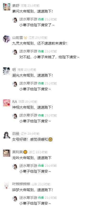 面对官方的“至尊皇帝”称呼,玩家们纷纷响应,评论区瞬间被“各流派大帝驾到,速速跪下”的口号所占据。而《逆水寒》手游官方也毫不含糊,一一回复“小寒子给陛下请安”,这种互动方式无疑让玩家感受到了前所未有的尊贵体验。