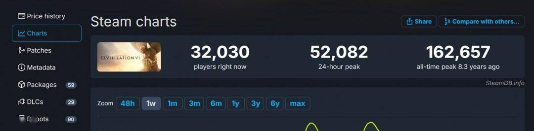 一般来说,好评率过低的游戏,其同时在线数据不会那么好看。果不其然,据SteamDB,《文明7》Steam同时在线峰值刚刚超过了8万人,为80103人。