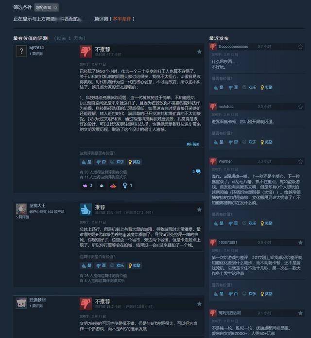 截止到目前,《文明7》Steam上共有13644篇评价,但好评率只有52%,为“褒贬不一”,差评评价竟然有8470条。