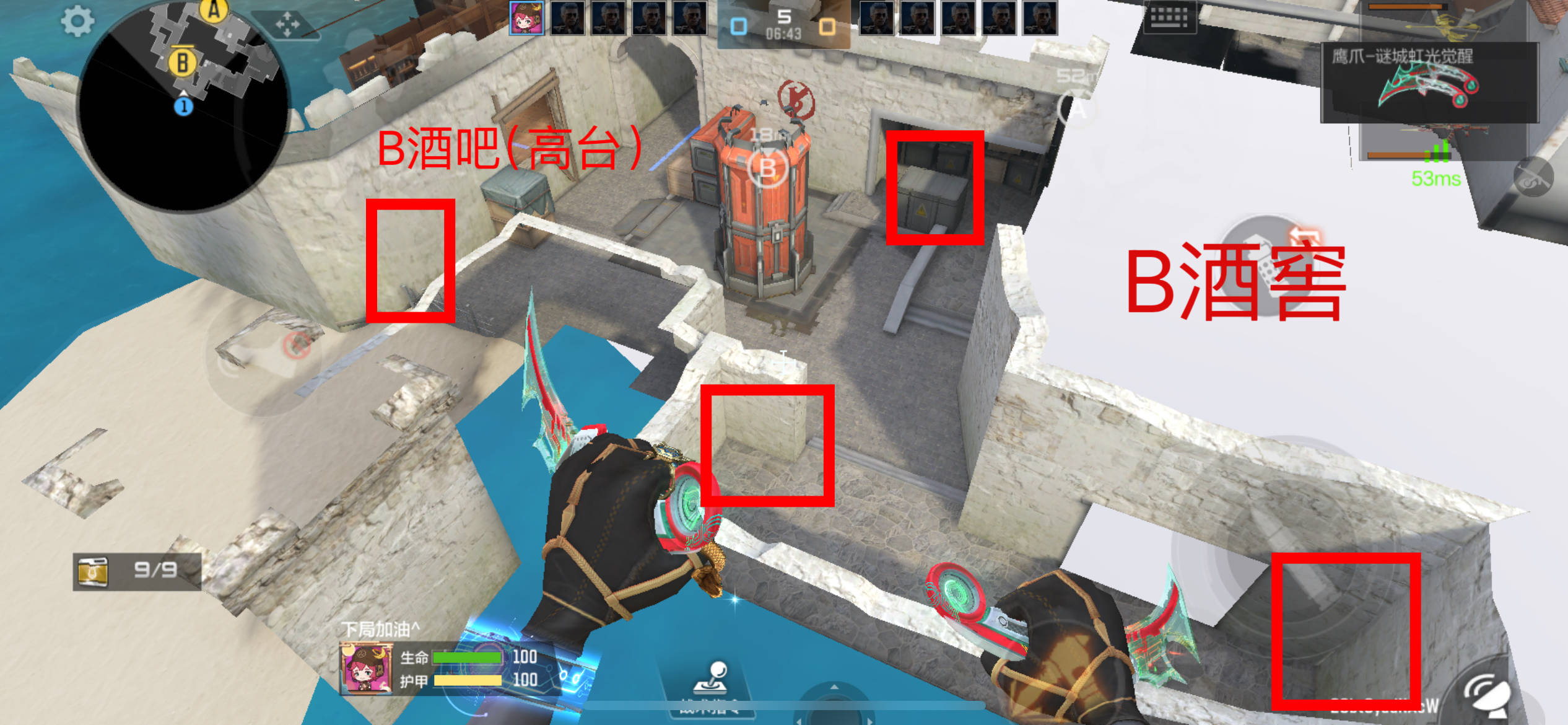 打进B包点后,守包时我们可以选择的老六点位就比较多了,如图所示,B包点有很多角落可以选择,但是我们主要讲一下B高台。