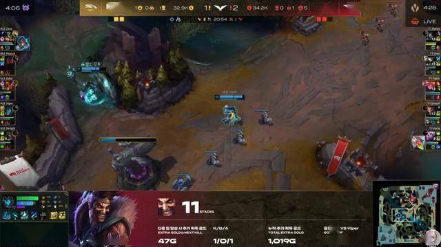 新人Smash这局的德莱文已经算是完美发育了,第一刀收获千金,第二刀再次斩获千金,两次赏金让他最高对位经济领先Viper的复仇之矛3000多,这个差距已经是接近一把无尽了。