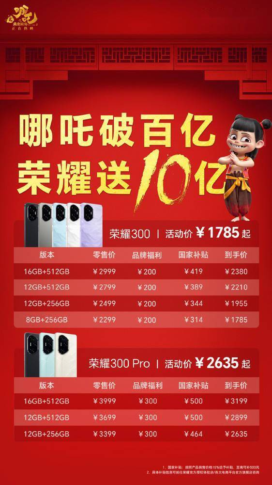 在众多向《哪吒之魔童闹海》表示祝贺的品牌中,荣耀手机显得格外大方。为了庆祝影片票房过百亿,荣耀宣布推出了一项高达10亿元的购机补贴活动,以此来回馈广大消费者。据悉,只要消费者持有《哪吒之魔童闹海》的电影票根或购买记录,在荣耀商城、各大授权电商平台、荣耀体验店以及授权零售门店购买荣耀300系列手机时,均可享受额外的优惠。