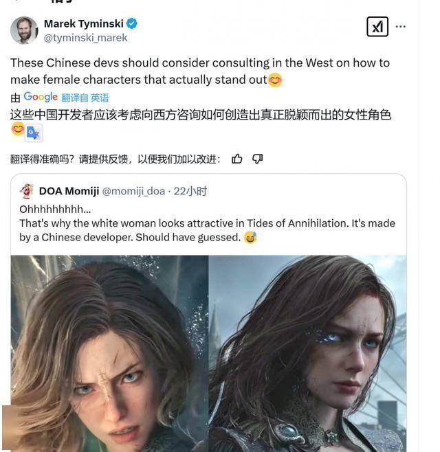 国产单机《湮灭之潮》亮相SIEState of Play发布会后,不但在国外社交媒体上引起了广泛的称赞,而且还引起了西方开发者同行的支持。GI Games CEO Marek Tyminski甚至在X上表示:“这些中国的开发者们真应该考虑下给西方公司提供咨询,以打造真正脱颖而出的女性角色。”