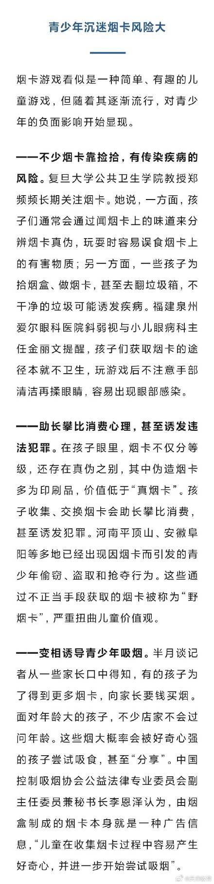 烟卡,是由废弃烟盒剪下来的烟标折叠而成的纸牌大小的方形卡片。因其花色丰富、可广泛收集,渐渐成为青少年的游戏新宠。除了作为游戏工具,烟卡存在诱导青少年吸烟的风险,还易被一些商贩炒作,用来赌博。 青少年沉迷烟卡风险大 不少烟卡靠捡拾,有传染疾病的风险; 助长攀比消费心理,甚至诱发违法犯罪; 变相诱导青少年吸烟。 如何为青少年架起烟卡“防火墙”?(半月谈)