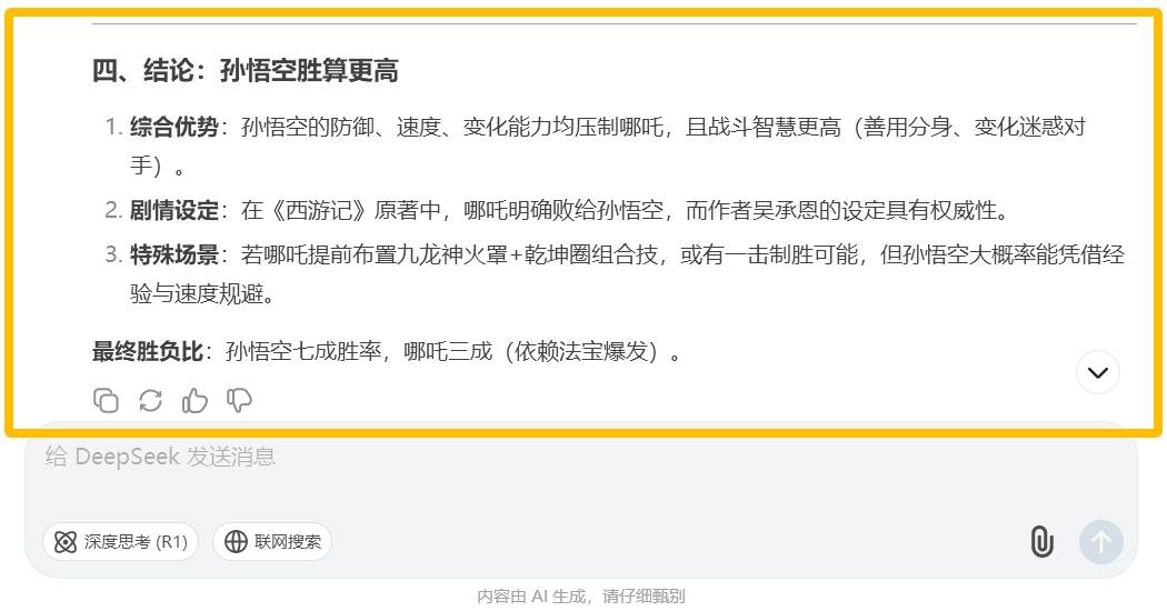 在中国神话的浩瀚宇宙中,哪吒与孙悟空无疑是两颗最耀眼的明星。一个是莲花化身、三头八臂的天庭战神,一个是石猴成精、大闹天宫的齐天大圣。如果这两位传奇角色正面交锋,究竟谁能笑到最后?今天,我们就从出身背景、神通法宝、实战表现等多个维度,让全球领先的人工智能大模型DeepSeek深度剖析这场巅峰对决!