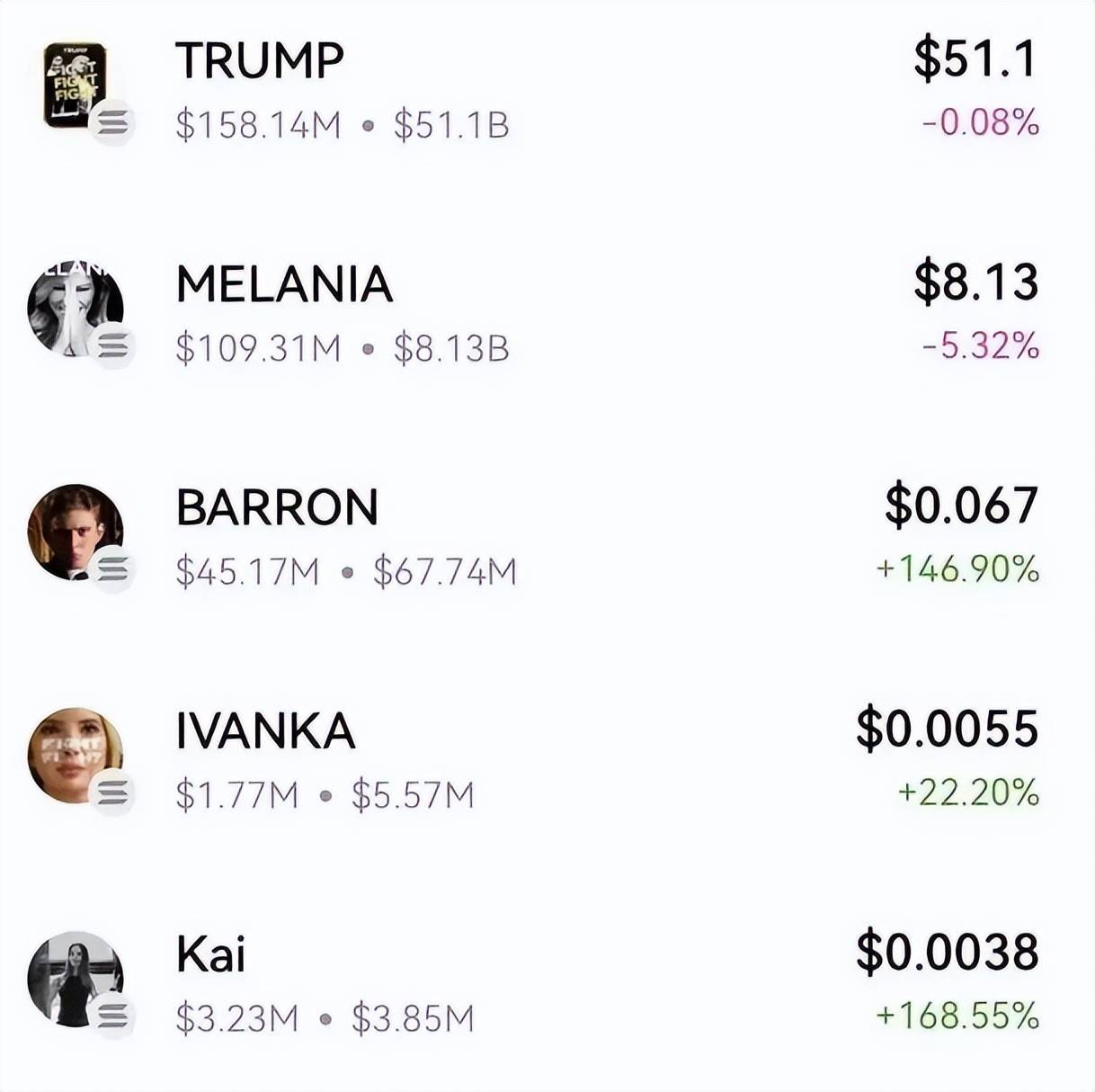 所以一时之间,“川币”的热度可以说是居高不下,而且连带着特朗普家族的其他成员都有了自己的meme币。