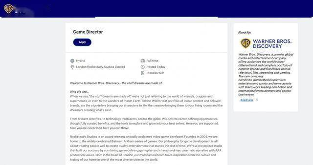 近日据外媒“TheGamer”报道,在华纳兄弟探索的官方网站上,Rocksteady工作室贴出了招聘信息。根据描述内容,Rocksteady正在招募一位具有第三人称动作游戏经验的游戏总监。