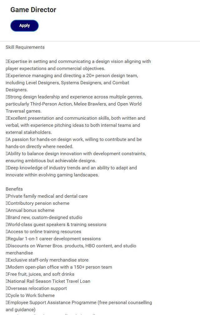 在招聘描述中提到,该职位需要负责“在整个游戏中提供高质量的设计,包括核心游戏机制、玩家进程、战斗系统和任务设计”,具体来说就是有着“强大的设计领导能力和跨多种类型游戏经验,尤其是第三人称动作游戏、近战格斗游戏和开放世界穿越游戏”等经验的人。