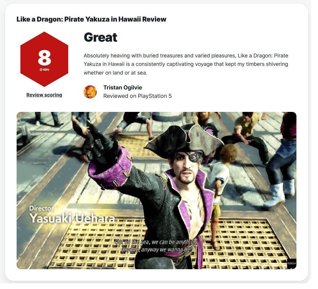 IGN对这款游戏同样给予了高度评价,打出了8分的“Great”评级。评论指出,《人中之龙 8 外传:夏威夷海盗》通过一段轻松且充满疯狂情节的寻宝故事,将街头暴力与阴险勾当巧妙结合,为玩家带来了全新的游戏体验。游戏中的角色真岛,以其独特的“海狗”战斗姿态,成为了系列中最受玩家喜爱的战斗风格之一,特别是在经典连招模式下更是大放异彩。