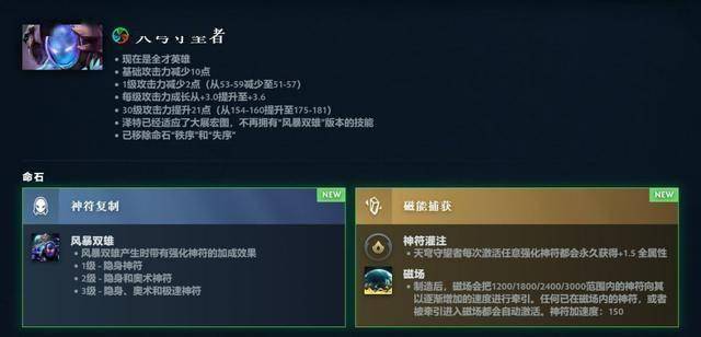 全才英雄得到平衡调整,现在全才英雄的每点属性提供攻击力从0.7减少至0.45,相应的很多英雄的基础攻击力和属性成长有所改变。独行德鲁伊、狼人、凤凰、发条技师等英雄不再是全才英雄;天穹守望者、死亡先知、幽鬼等英雄加入全才英雄。