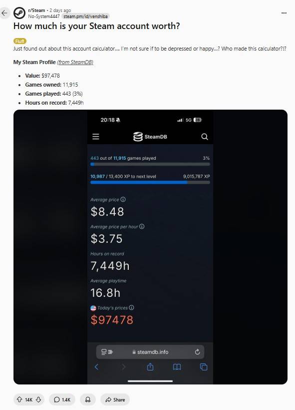 但该说不说,这项新功能确实能够尽可能细致地,让玩家对自己的账号内容有个比较清楚的认知。有网友就分享了自己的账号数据,上面显示了3542元的库存总价值。而从没有玩过的游戏价值297元,平均下来他每玩一小时游戏,就得花费3毛6。