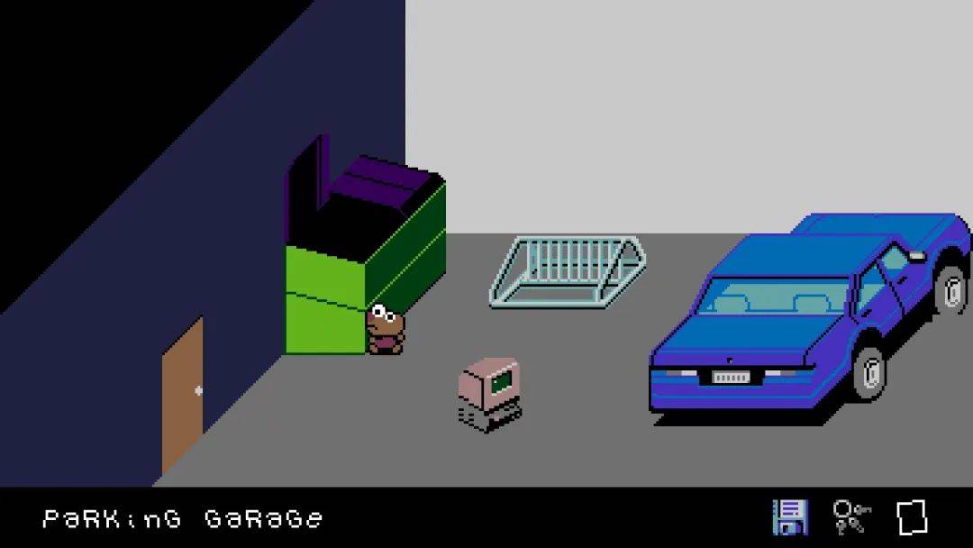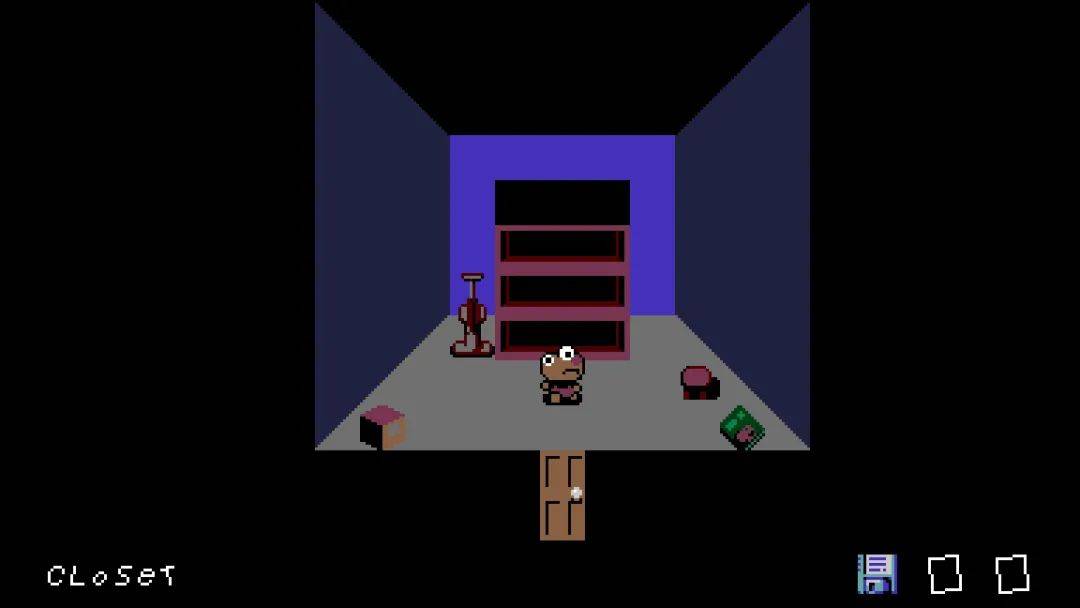 这一次,我们的青蛙主角从一处壁橱中醒来,身上仍带着第一张软盘,这是上次进入《瘴气塔》时从地下室取得的。房间里有一些 UFO Soft 公司的杂物,我们不知身处何处,只能走出房门。