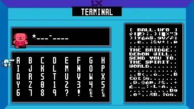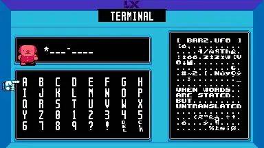 存在需要被翻译的陌生言语,意味着存在新的种族或环境,同时大概率是包含对话机制的冒险主题游戏。那么可以看向 #8《Planet Zoldath》(佐达斯星球),我们扮演的外星人因飞船失事而迫降在奇异星球上,且与各种当地生物言语不通。四处探索,与能见到的第一位角色对话,即会出现读不懂的乱码字符,此时,打开终端: